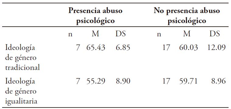 Las participantes que no presentaban abuso psicológico manifestaron una ideología tradicional e igualitaria casi en la misma proporción que el grupo que presentaba abuso psicológico (tradicional ligeramente por encima de la igualitaria). Este importante hallazgo puede ser explicado a partir de lo expuesto por Davis & Greenstein (2009), quienes consideran que los individuos tienden a tener una visión menos igualitaria como una forma de disminuir la disonancia cognoscitiva que experimentan en sus interacciones interpersonales y sociales; donde, por un lado, se aspira a una visión igualitaria y, por el otro, se vive en un ambiente de inequidad de género como norma cultural, principalmente en los ámbitos del matrimonio y en su experiencia como padres.