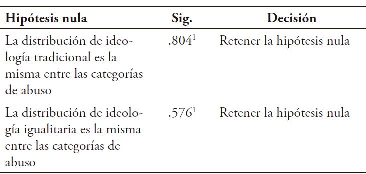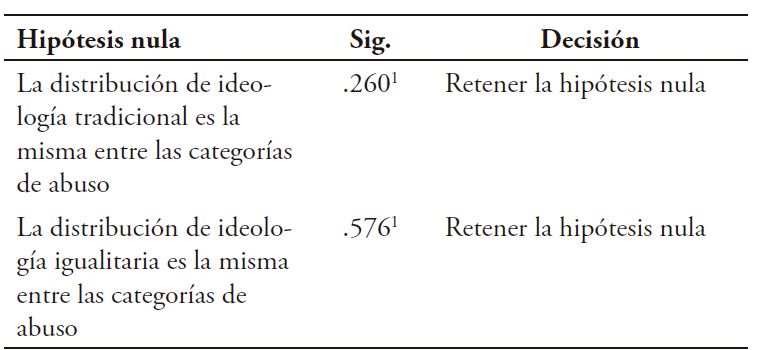 Se muestran las significancias asintóticas. El nivel de significancia es .05. Se muestra la significancia exacta para esta prueba. Debido a la inexistencia de normalidad en las variables, se procedió a realizar la prueba Mann U Whitney para muestras independientes. Este estadístico arroja que no existen diferencias significativas entre la ideología de género tradicional e igualitaria con las participantes que presentaban abuso psicológico.