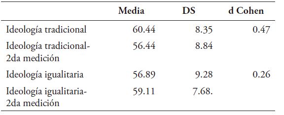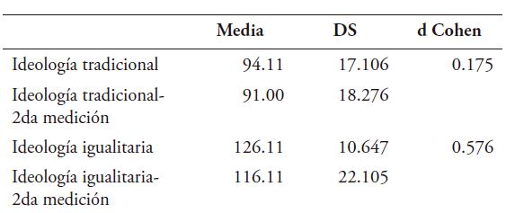 Al comparar las medias y las desviaciones estándar de la ideología tradicional, antes y después de la intervención con los talleres, se obtuvo un tamaño del efecto moderado d = 0.47. Al hacer lo mismo con la ideología igualitaria, se pudo apreciar un tamaño del efecto pequeño d = .26.