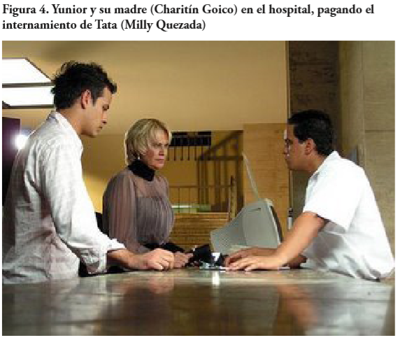 Uno de los momentos más sensibles tuvo lugar cuando Tata sufrió un infarto. Al llevarla a un importante hospital privado de Santo Domingo, la administración rehusó atenderla porque no tenía seguro médico ni dinero. Fue doña Aurora quien asumió el pagó de la clínica. Todavía en la recepción del hospital, Yunior (figura 4) empezó a contarle a su madre, al tiempo que lloraba casi sin control, todo el sufrimiento que presenció en el barrio. Esto lo hizo reflexionar sobre lo difícil que resultaba la vida para los pobres.