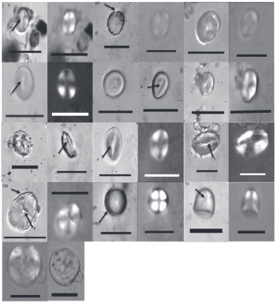 Los gránulos de almidón encontrados se describieron utilizando las variables propuestas por Pagán (2007) que incluyen: forma del gránulo, forma y posición del hilum, características del laminado, tonalidad, largo, ancho (o longitud del diámetro en el caso de los gránulos esféricos), estructura, forma de la cavidad o fisura, facetas de depresión, tipo de borde y punto de flexión. La identificación taxonómica de las plantas se llevó a cabo según las propuestas métricas y morfológicas de Reichert (1913), la colección de referencia de Pagán (2007) y los trabajos previamente publicados (Sívoli, et al., 2009; Pagán et al., 2015).