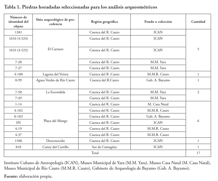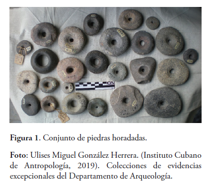 El registro de piedras horadadas recuperadas en sitios arqueológicos del archipiélago cubano suma un total de 60 piezas en contexto almacén. De ellas, fueron estudiadas un total de 52 en las que fue posible definir sus atributos formales y posibles usos, así como fotografiar, por vez primera, una colección de piedras horadadas de esta magnitud. Para la caracterización de los atributos físicos de las evidencias se consideraron las siguientes variables: