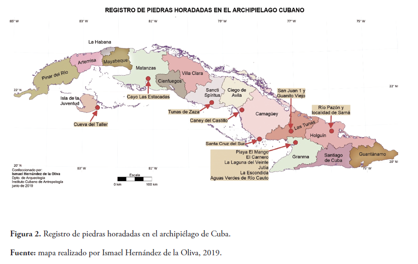 En el caso cubano, estos objetos han sido colectados en los sitios arqueológicos de Playa del Mango, El Carnero, La Laguna del Veinte, Jutía, La Escondida y Aguas Verdes de Río Cauto; cuenca del referido afluente en la provincia de Granma. De Holguín se poseen dos piezas, una correspondiente a un residuario indígena próximo al río Pazón y otra de la localidad de Samá. También se reportó la existencia de dos piezas en los sitios arqueológicos de San Juan 1 y Guanito Viejo, Sur de Las Tunas (Colectivo de autores, 2019), así como otro perteneciente a la localidad de Tunas de Zaza, en Sancti Spíritus (Harrington, 1921). En Camagüey se conoce de la existencia de dos ejemplares, uno de la localidad de Santa Cruz del Sur (Montané, 1901) y otro de Caney del Castillo (Guarch y Payarés, 1964). Hacia el occidente del archipiélago se localizaron en el Cayo de las Estacadas, Ciénaga de Zapata (Cosculluela, 1965), la Cueva del Taller o Cueva No. 2 de Punta del Este, Isla de La Juventud (Ortiz, 2008); así como en Río Chico, donde fue recuperado un posible fragmento de anillo de piedra pulida (Pino, 1993) (Figura 2).