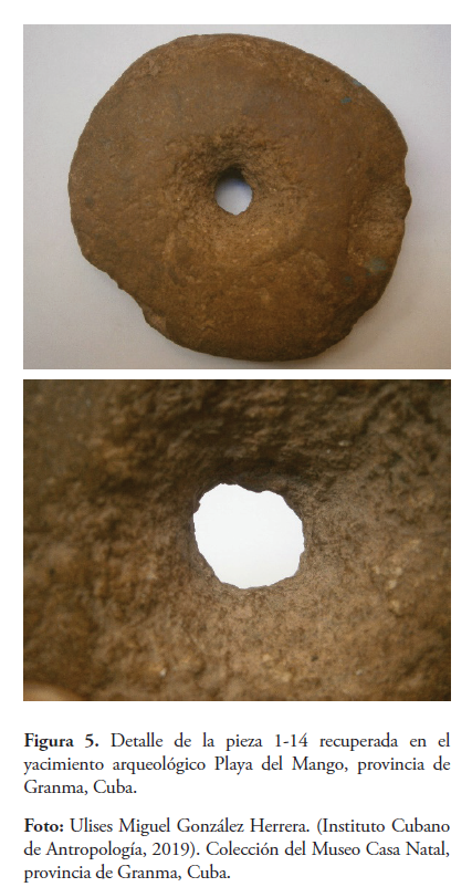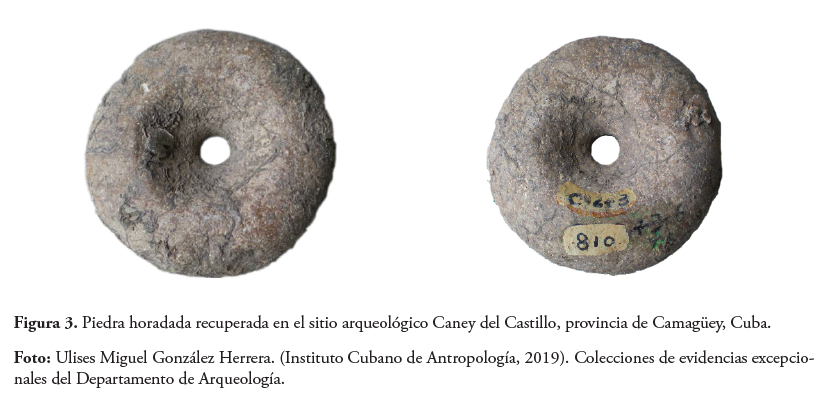 Las piedras horadadas son reducidas en número y se corresponden estratigráficamente con los últimos niveles de ocupación indígena en la cuenca del Río Cauto, lo que indica, al menos en el yacimiento de Playa del Mango, la adopción de una nueva tecnología especializada hacia el 1700 A. P.