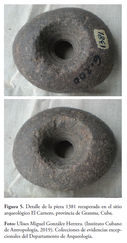 Dos excepciones revelan su empleo estrictamente como morteros. La catalogada con el No. 4-100, colectada en la Laguna del Veinte, Río Cauto, que es una pieza masiva con perforación cónica. Alrededor de las paredes de la depresión se observan macrodestrucciones causadas por percusión en el interior. El agujero es irregular y sin bordes filosos. La cara que no presenta depresión expone huellas de haber sufrido presión, posiblemente por su contacto con el suelo. Y la No. 4116, colectada junto al río Pazón (Morales Patiño, 1948), no incluida en el estudio arqueométrico. Esta pieza expone perforación cónica, borde interior redondeado, asimétrica en su diámetro menor y superficie pulida. Ambos objetos parecen haber sido utilizados hasta el proceso de descarte.