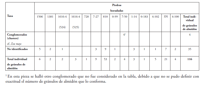 Los atributos formales de las piedras horadadas, exceptuando la perforación central, se corresponden con las denominadas manos de molino, cuyas funciones estuvieron asociadas a la maceración de recursos vegetales para obtener harinas y papillas. Evidencias de este tipo, así como bases de molino, también han sido recuperadas en los sitios arqueológicos de estudio. Ello, junto a la identificación de gránulos de almidón adheridos a los artefactos, indica con bastante certidumbre que los objetos estuvieron primeramente asociados al complejo de molienda-maceración y con posterioridad, fueron reutilizados para la preparación de taladros de cuerda, ya sea con fines de obtener fuego o perforar otros objetos sólidos. Ninguna de las funciones estimadas hasta el momento permite incluir los útiles dentro del apartado de objetos rituales y ceremoniales. Los resultados obtenidos con la recuperación de gránulos de almidón, como evidencia de la manipulación de recursos botánicos, están en concordancia con los hallados en cuatro maceradores-tritutadores y en el cálculo dental de restos humanos exhumados en el sitio Playa del Mango. Las plantas identificadas han sido reportadas en otros sitios arqueológicos de Cuba y del resto de Las Antillas asociados a poblaciones de bajos niveles productivos (Pagán, Rodríguez, Chanlatte y Narganes 2005; Pagán, 2009; 2011; 2012; 2013; Mickleburgh y Pagán, 2012; Chinique et al., 2015).
