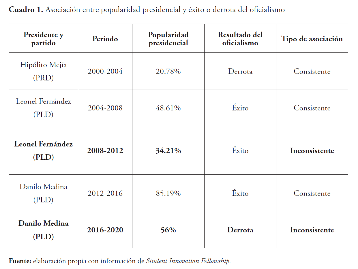 El resultado que arrojó el análisis de la experiencia dominicana es que en el 60 % de los casos, el éxito oficialista fue precedido por una alta popularidad del titular del ejecutivo, o viceversa, su derrota fue antecedida por una baja aprobación. Registramos una tendencia incipiente, pero mayoritaria hacia la asociación entre nuestras variables sin alcanzar la consistencia observada en otros países de la región. En los comicios presidenciales de 2004, 2008 y 2016 comprobamos asociación entre popularidad presidencial y resultado electoral del oficialismo. En cambio, en las elecciones presidenciales de 2012, el gobernante PLD consiguió retener el poder a pesar de que el mandatario de turno, Leonel Fernández, contaba con una aprobación baja: 34 %. En tanto, en los comicios presidenciales de 2020 el PLD fue derrotado pese a la alta aprobación del titular del ejecutivo, Danilo Medina.