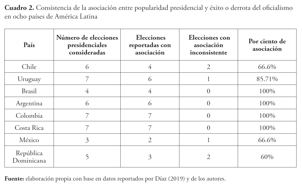 Por su parte, Díaz (2019 y 2019a), con base en una muestra integrada por la totalidad de los comicios presidenciales competitivos (38) celebrados en siete países de la región (Chile, Argentina, Brasil, Uruguay, Colombia, Costa Rica y México) desde el inicio de la transición a la democracia en 1983 hasta 2018, comprobó que en el 89.47 % de los casos la popularidad del gobernante de turno anticipó el éxito o la derrota del partido en el gobierno, una alta popularidad fue seguida por el triunfo del candidato oficial y una baja por la derrota.