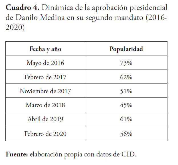 En julio de 2020 el PLD acudió a su quinta elección presidencial consecutiva en calidad de partido gobernante10. Las fortalezas del PLD eran que su gestión se había desarrollado en un marco de relativa estabilidad y crecimiento económico 11. El PLD enfrentaba una oposición debilitada donde su principal contendiente, el Partido Revolucionario Moderno (PRM), constituía una organización de reciente formación (2014) que tomaba parte en su segunda elección presidencial. Mientras el gobernante de turno, Danilo Medina, luego de experimentar una caída de 28 puntos de su popularidad durante 2017 y 2018 (de 73 % en mayo de 2016 cayó a 45 % en marzo de 2018) su aprobación no solo no colapsó, sino que se recompuso arribando a la etapa previa al inicio de la campaña con una aprobación alta.