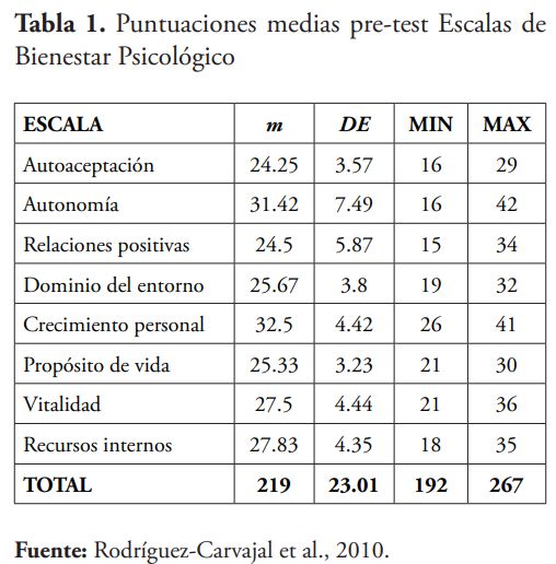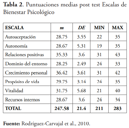 Luego de la intervención (post-test), la puntuación media global en las Escalas de Bienestar Psicológico (Rodríguez-Carvajal et al., 2010) fue de 247.58 (DE= 21.40). La tabla 2 muestra las puntuaciones medias por escala luego de la intervención. Estos resultados evidencian un aumento en los niveles de Bienestar Psicológico de los participantes luego de la intervención.