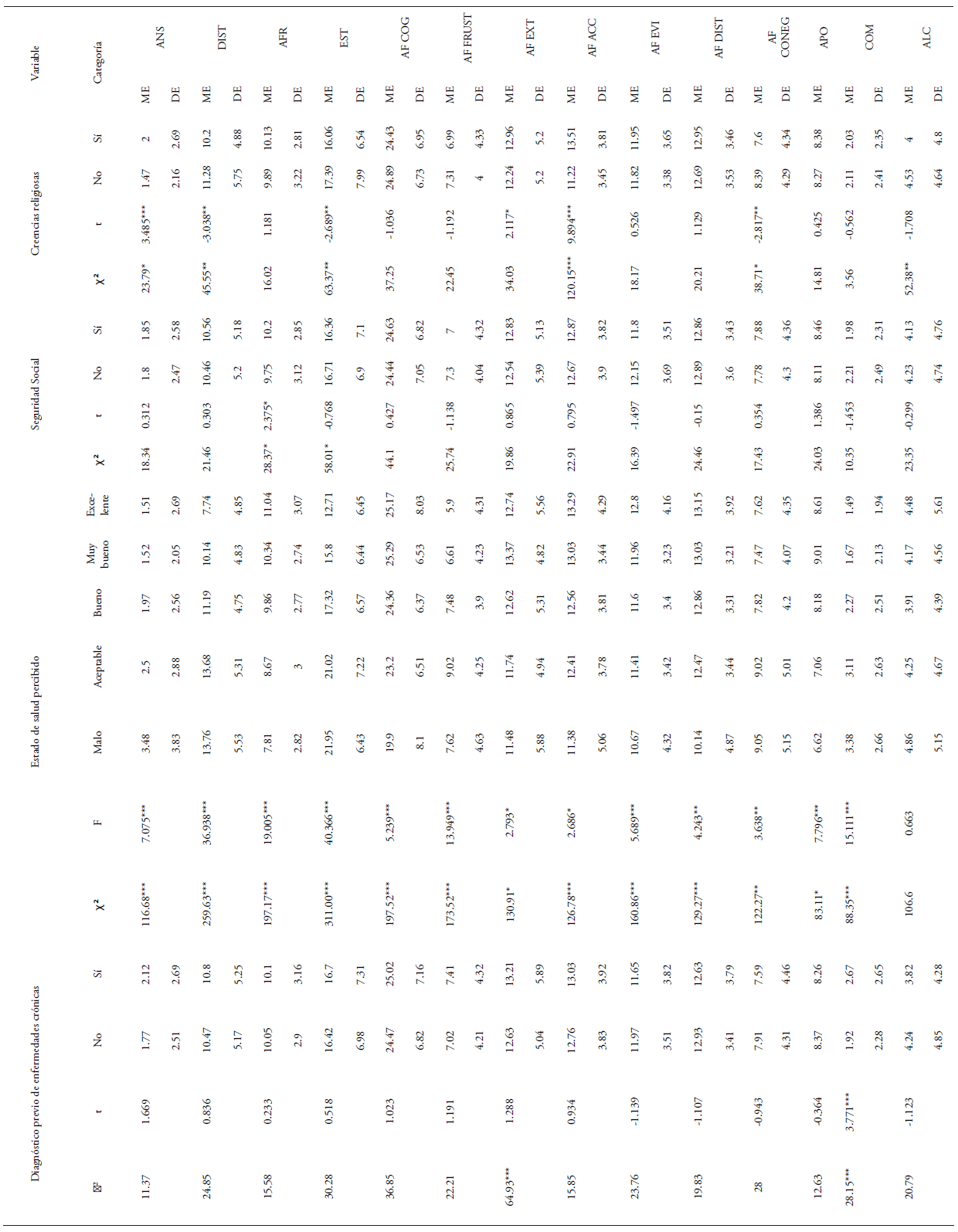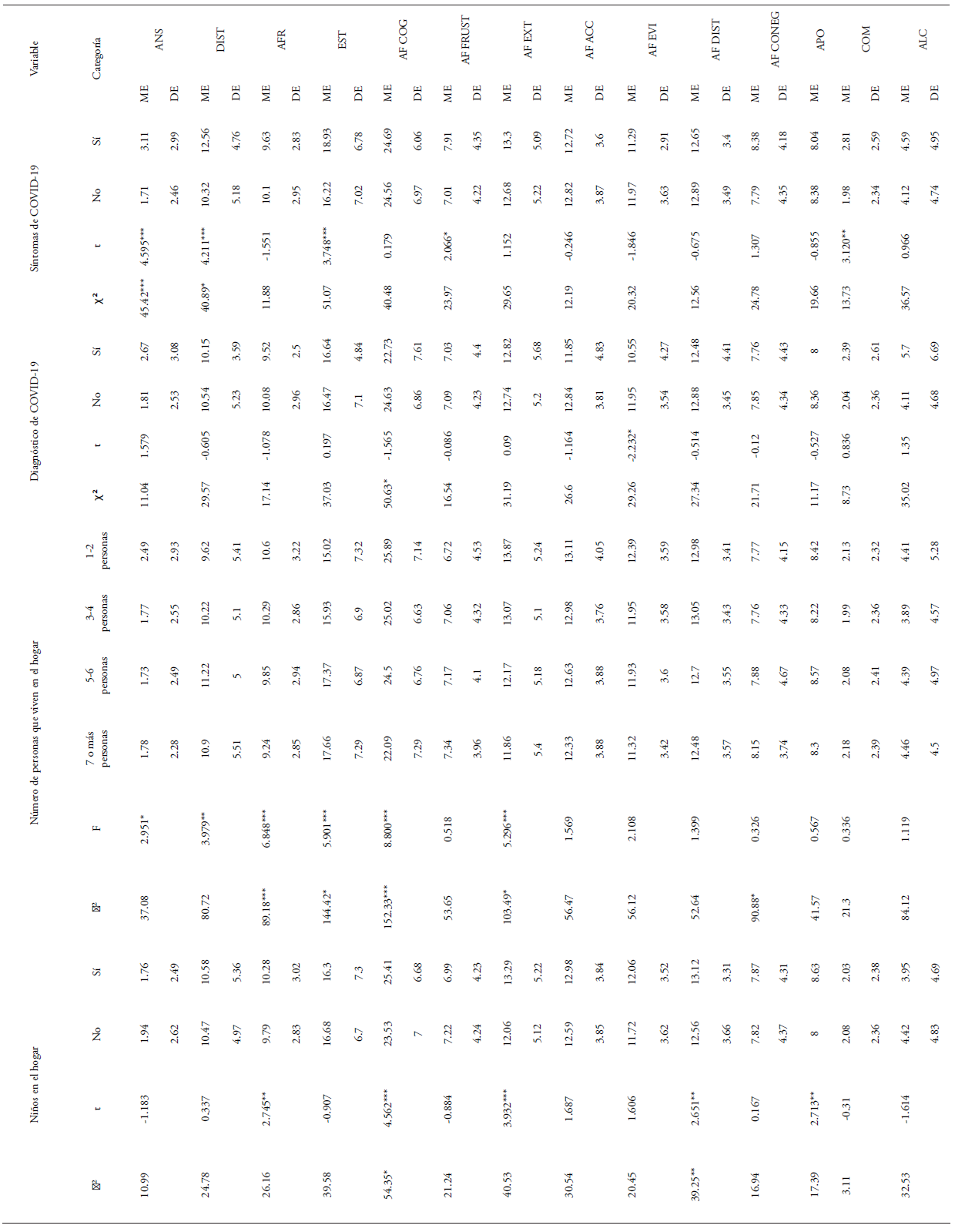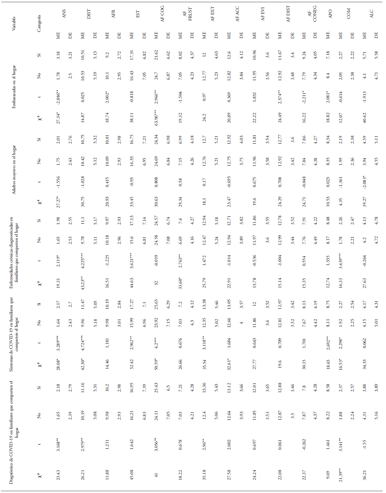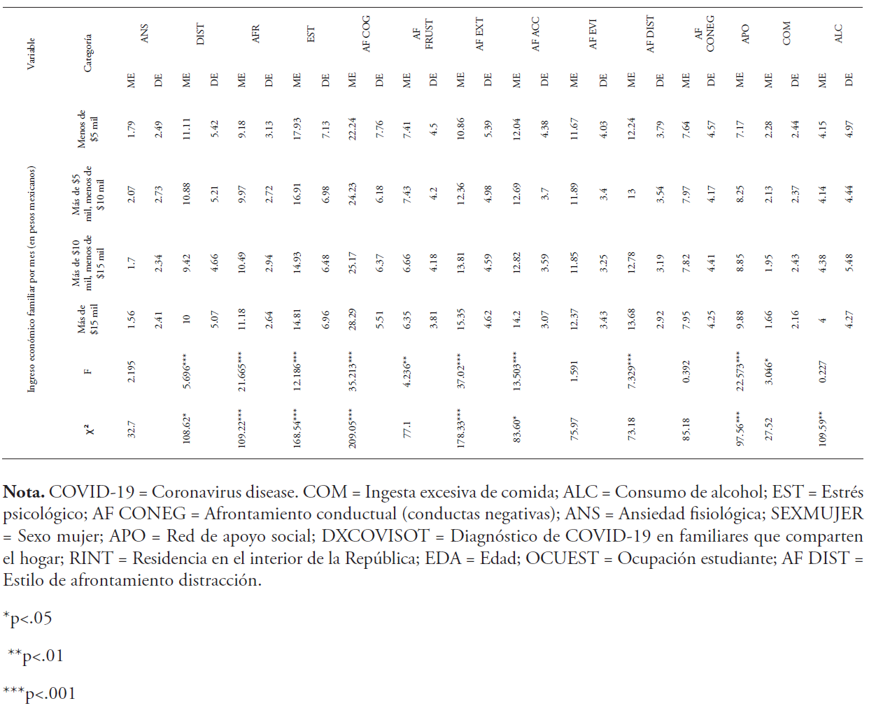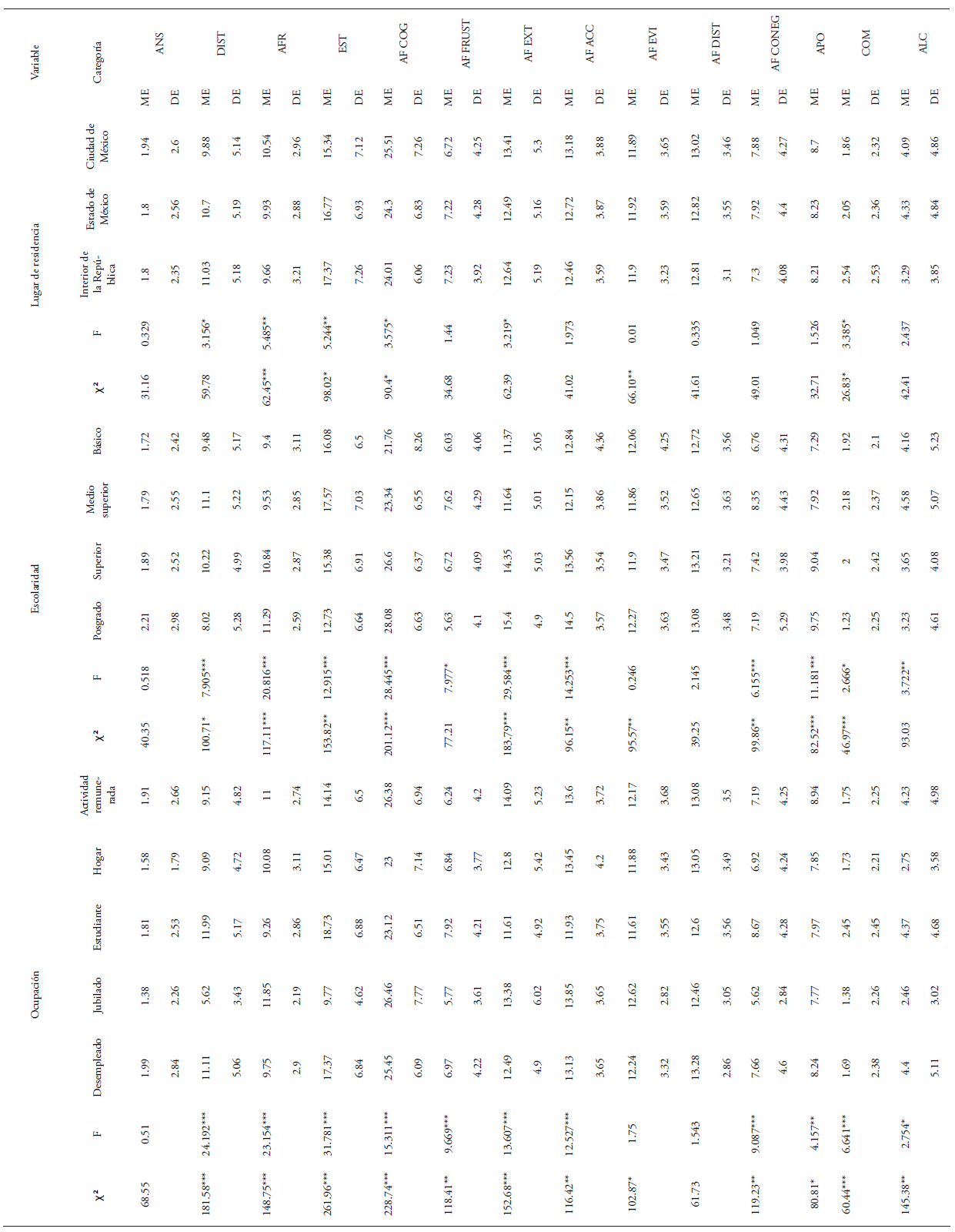 Aunado a lo anterior, se observó que los participantes de sexo femenino (ME = 2.52; DE =2.51), en adultez temprana (ME = 2.16; DE = 2.4), solteros (ME = 2.21; DE = 2.41), residentes del interior de la República Mexicana (ME = 2.54; DE = 2.53), con escolaridad media superior (ME = 2.18; DE = 2.37), estudiantes (ME = 2.45; DE = 2.45), con ingresos familiares mensuales menores a $5 mil pesos mexicanos (ME = 2.28; DE = 2.44), que percibieron un mal estado de salud (ME = 2.38; DE = 2.66), que contaban con diagnóstico previo de enfermedades crónicas (ME = 2.67; DE = 2.65), síntomas (ME = 2.81; DE = 2.59) o diagnóstico de COVID-19 (ME = 2.39; DE = 2.61) y además convivían con familiares diagnosticados con enfermedades crónicas (ME = 2.26; DE = 2.47), síntomas (ME = 2.27; DE = 2.54) o diagnóstico de COVID-19 (ME = 2.37; DE = 2.57) obtuvieron puntuaciones más altas que el resto de los grupos (ver apéndice 1). Como muestra la tabla 2, las diferencias y asociaciones encontradas fueron significativas (p < .05).