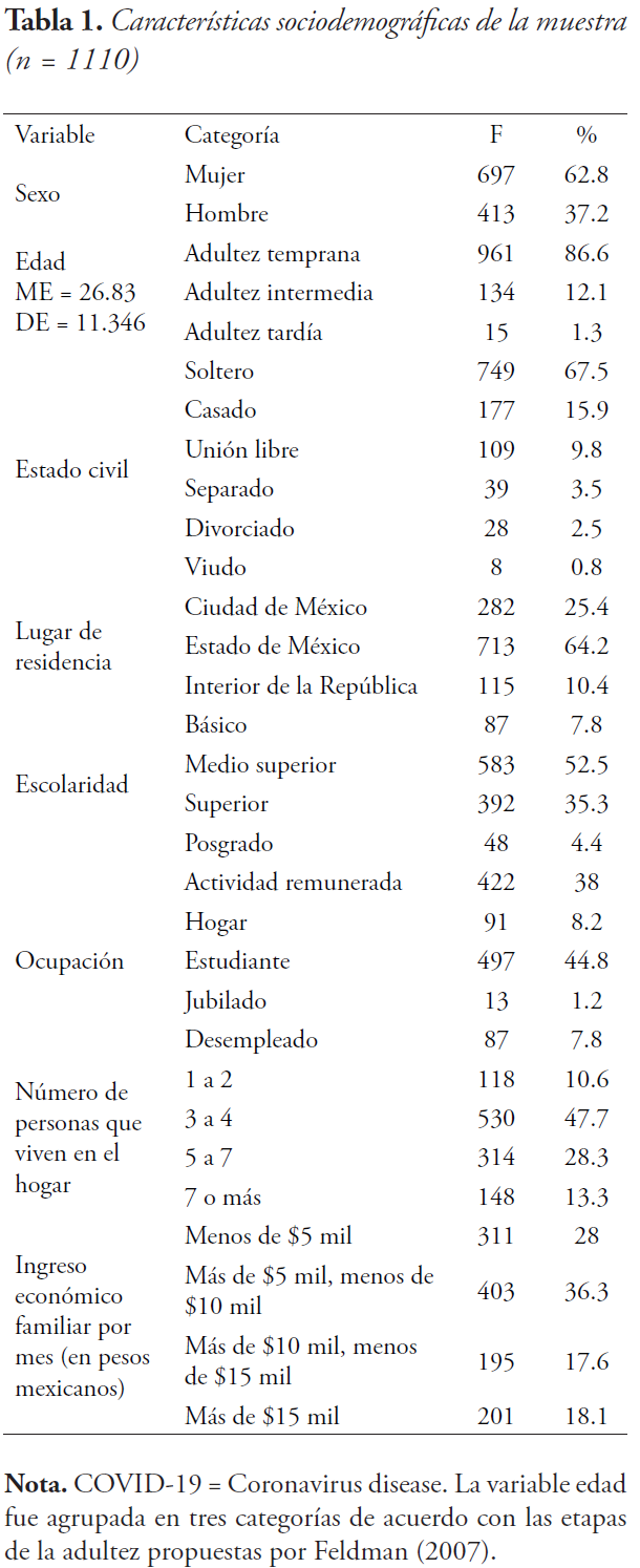 Debido a las medidas nacionales de distanciamiento social para el control del brote epidémico, se eligió un muestreo no probabilístico tipo bola de nieve. Se diseñó y aplicó una encuesta en línea a través de Google Forms®. El índice de respuesta obtenido fue del 96.5 %, ya que 51 personas no proporcionaron su consentimiento para el uso de datos. Además, se excluyó la información de 290 participantes menores de edad y 25 más que reportaron residencia fuera de México. Adicionalmente, 48 datos no fueron considerados debido a la detección de repeticiones y omisiones en la información sociodemográfica. Por tanto, la muestra final estuvo constituida por 1110 mexicanos (62.8 % mujeres y 37.2 % hombres). El promedio de edad fue de 26.83 años (DE = 11.346). La mayoría refirió residencia en el Estado de México (64.2 %), estado civil soltero (67.5 %), nivel de estudios medio superior (52.5 %), ocupación estudiante (44.8 %), tener con algún tipo de creencias religiosas (69.2 %) y contar con seguridad social (69.2 %).