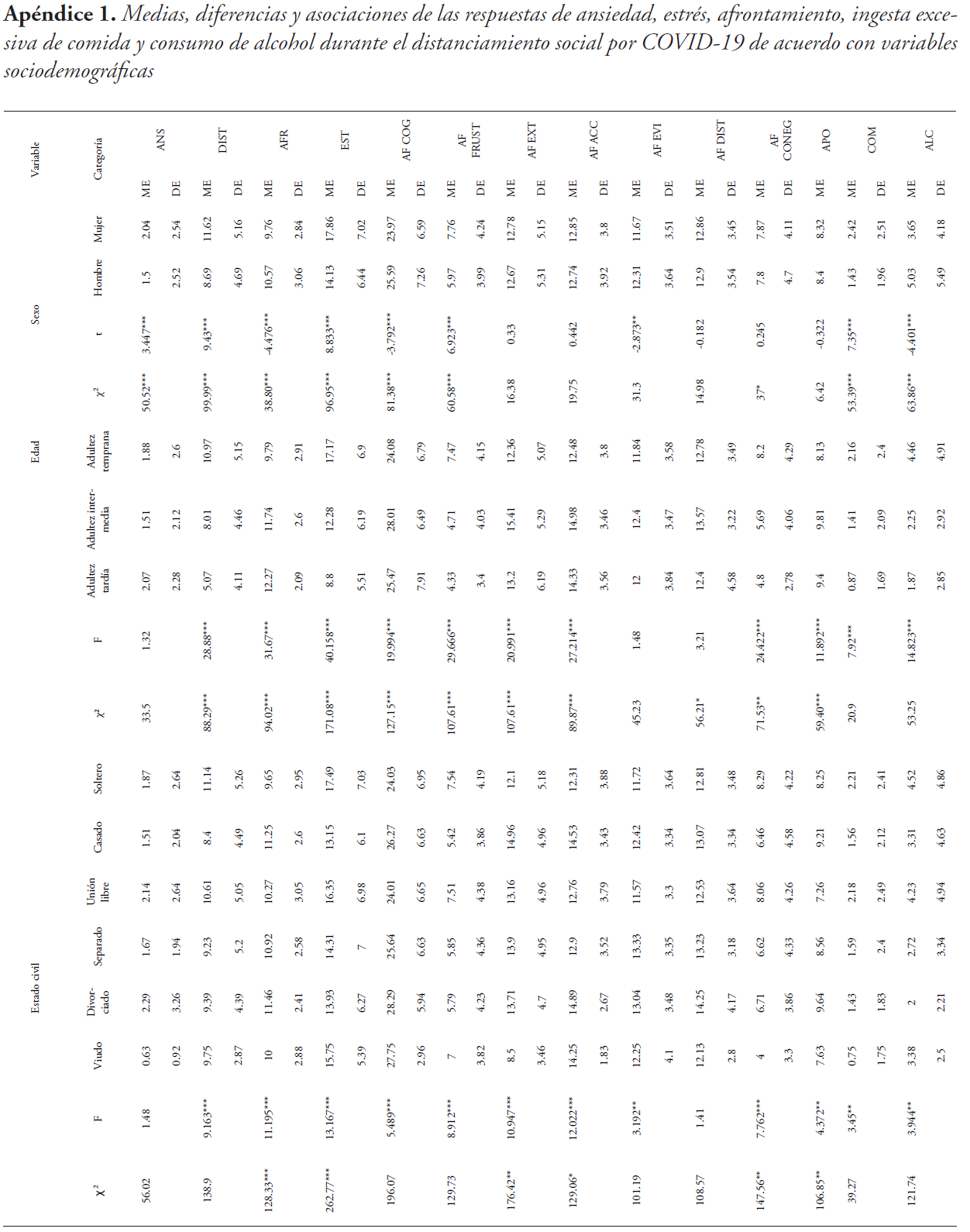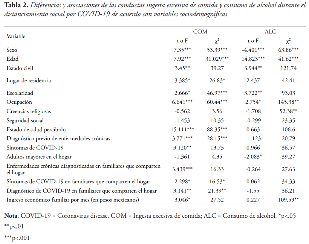 El distanciamiento social por COVID-19 puede ser una experiencia asociada a emociones desagradables y estrés, capaz de exacerbar la ingesta emocional de comida y bebidas alcohólicas como forma de afrontamiento. Con el objetivo de explorar la conducta alimentaria y el consumo de alcohol durante el distanciamiento social por COVID-19 e identificar las variables psicosociales asociadas a dichas conductas, se diseñó un estudio transversal exploratorio, descriptivo y correlacional, con aplicación de una encuesta en línea, a una muestra no probabilística de 1110 mexicanos. A partir del análisis de regresión lineal múltiple, se encontró que las variables: estrés, conductas negativas, ansiedad, sexo femenino, convivencia con un familiar con diagnóstico de COVID-19 y lugar de residencia en el interior de la República Mexicana son factores que predicen el consumo excesivo de comida durante el distanciamiento físico, mientras que el apoyo social es un factor protector(