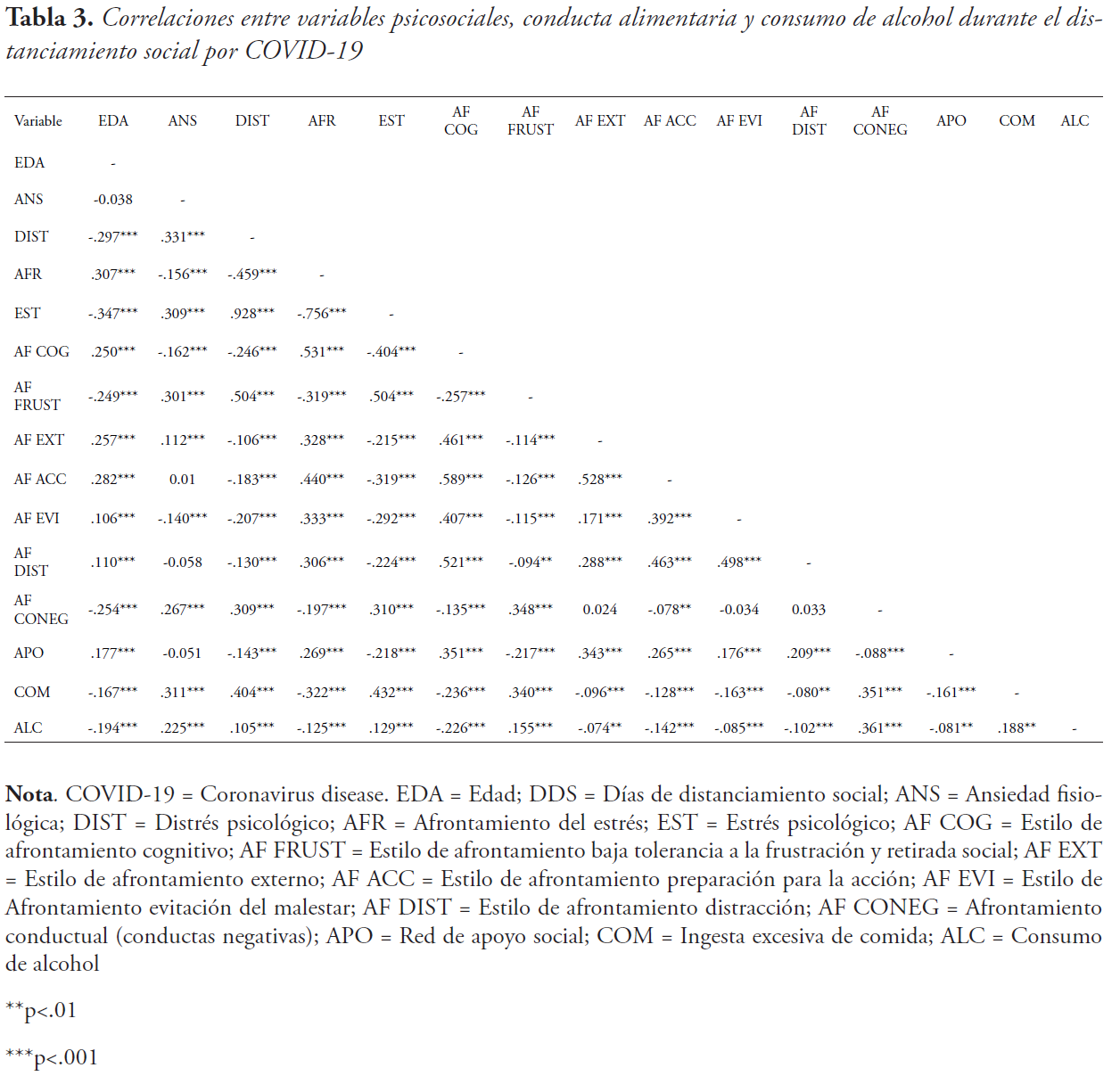 Por otro lado, en la tabla 3 se presentan las correlaciones entre variables psicosociales (edad, ansiedad fisiológica, estrés psicológico y afrontamiento) y las conductas ingesta excesiva de comida y consumo de alcohol durante el distanciamiento social por COVID-19. La mayoría de los coeficientes de correlación (r) resultaron significativos y fluctuaron entre débiles y fuertes. Destacan las relaciones positivas entre la ingesta excesiva de comida y estrés (r = .432, p < .001), ansiedad (r = .311, p < .0001), baja tolerancia a la frustración y retirada social (r = .340, p < .0001) y conductas negativas (r = .351, p < .0001). Las relaciones negativas tuvieron lugar, principalmente, con las variables afrontamiento (r = -.322, p < .0001), estilo de afrontamiento cognitivo (r = -.236, p < .0001) y apoyo social (r = -.161, p < .0001). Igualmente, se hallaron relaciones positivas entre el consumo excesivo de alcohol y estrés (r = .129, p < .0001), ansiedad (r = .225, p < .0001), conductas negativas (r = .361, p < .0001) e ingesta excesiva de alimentos (r = .188, p < .0001). En contraste, las principales relaciones negativas se presentaron con afrontamiento (r = -.125, p < .0001), afrontamiento cognitivo (r = -.226, p < .0001) y distracción (r = -.102, p < .0001).