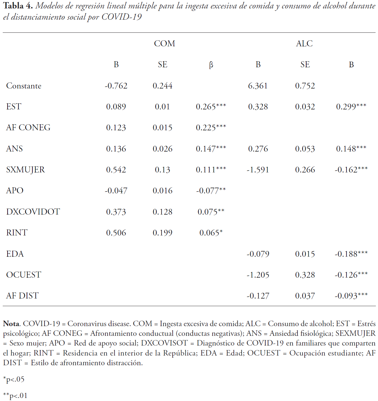 Los resultados del análisis de regresión lineal múltiple para las conductas consumo excesivo de comida y alcohol se presentan en la tabla 4. Un total de siete predictores explican la ingesta excesiva de comida durante el distanciamiento social por COVID-19 (R = .535; R2 = .286; AR2 = .281), mientras que seis predictores conforman el modelo para el consumo de alcohol durante el mismo periodo (R = .453; R2 = .205; AR2 = .200).