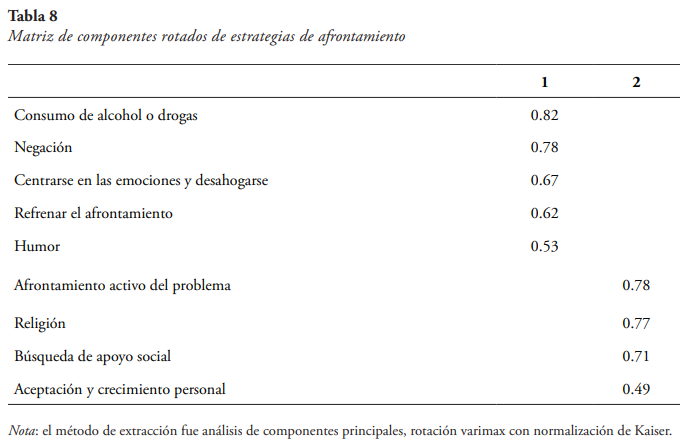 Para contestar la tercera pregunta de investigación sobre la categorización de tipos de estrategias de afrontamiento, se realizó un análisis de componentes principales de las subescalas de estrategias de afrontamiento con rotación varimax, permitiendo extraer dos factores. Los resultados de la prueba de esfericidad de Bartlett indican que es apropiado usar un análisisfactorial en estos datos, debido a la significancia general de las correlaciones en la matriz de correlaciones (X2 (36) = 317.03, p < .001). De igual forma, la medición de Kaiser-Meyer-Oklin indica que es aceptable proceder con el análisis (KMO = .70). El análisis organizó las subescalas en dos componentes: (1) Afrontamiento negativo, incluyendo consumo de alcohol o drogas, negación, centrarse en las emociones y desahogarse, refrenar el afrontamiento, y humor; (2) Afrontamiento positivo, incluyendo aceptación y crecimiento personal, búsqueda de apoyo social, religión y afrontamiento activo del problema. Ambos factores explican el 52.29 % de la varianza. La tabla 8 contiene los valores de cada componente
