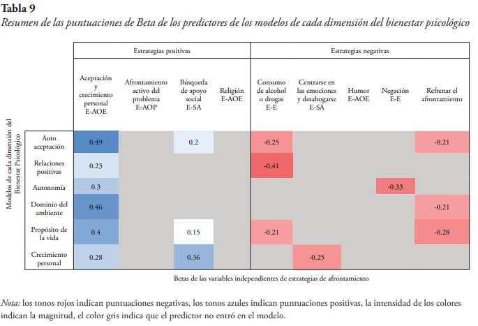 Para contestar la cuarta pregunta de investigación sobre la manera en la que las estrategias de afrontamiento positivo y negativo predicen el bienestar psicológico, se creó una tabla de contingencia con las puntuaciones de beta estandarizadas en la intersección de las estrategias de afrontamiento y dimensiones del bienestar. La tabla 9 presenta un resumen de las puntuaciones de las betas estandarizadas de los modelos de predicción de cada dimensión de bienestar psicológico organizados según tipo de estrategias de afrontamiento (positivas y negativas). Las estrategias positivas que contribuyeron a los modelos de predicción fueron la aceptación y crecimiento personal, y la búsqueda de apoyo social. Las estrategias negativas que contribuyeron a los modelos de predicción fueron el consumo de alcohol o drogas, refrenar el afrontamiento, centrarse en las emociones y desahogarse, y la negación.