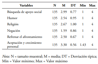 Para medir las variables de estrategias de afrontamiento se utilizó el Cuestionario de Orientación para Afrontar Problemas Experimentados (COPE-48, por sus siglas en inglés) creada por Carver (1997) y Carver et al. (1989), y adaptada al español por Martínez-Ortega et al. (2018) y Martínez Ortega et al. (2016). Este instrumento mide la frecuencia de uso de estrategias de afrontamiento. La versión española consta de 48 ítems y 9 subescalas con una escala tipo Likert. Cada ítem solicita a los participantes indicar la frecuencia con la que emplea las estrategias de afrontamiento presentadas, con respuestas desde el valor 1 (no lo hago nunca) hasta el valor 4 (lo hago muchas veces). Este instrumento cuenta de las siguientes subescalas: afrontamiento activo del problema, consumo de alcohol o drogas, centrarse en las emociones y desahogarse, búsqueda de apoyo social, humor, religión, negación, refrenar el afrontamiento, y aceptación y crecimiento. La subescala de afrontamiento activo del problema mide qué tanto la persona da pasos en concreto y planifica cómo va a resolver alguna situación estresante. La subescala de consumo de alcohol o drogas mide qué tanto la persona consume alcohol o drogas para sentirse bien o aliviar el malestar causado por una situación estresante. La subescala de centrarse en las emociones y desahogarse mide qué tanto la persona se enfoca en la situación estresante quejándose de la misma. La subescala de búsqueda de apoyo social mide qué tanto la persona solicita asistencia, ayuda o información tanto para resolver la situación estresante, como buscando apoyo moral y empatía. La subescala de humor mide qué tanto la persona tiende a burlarse y reírse de las situaciones estresantes. La subescala religión que mide la tendencia de dirigirse hacia la espiritualidad o religión en momentos de estrés. La subescala de negación mide la frecuencia con la que la persona desestima el estresor negando su existencia. La subescala de refrenar el afrontamiento mide qué tanto la persona actúa de manera pasiva ante la situación estresante, en aras de esperar a que sea un momento adecuado para afrontar el estresor. La subescala de aceptación y crecimiento mide qué tanto la persona es capaz de entender y aceptar la situación estresante y regular sus emociones alrededor de la misma. El instrumento obtuvo una consistencia interna de buena a muy buena, evidenciada por puntuaciones de alfa de Cronbach que oscilaban entre .70 y .97 para las subescalas.