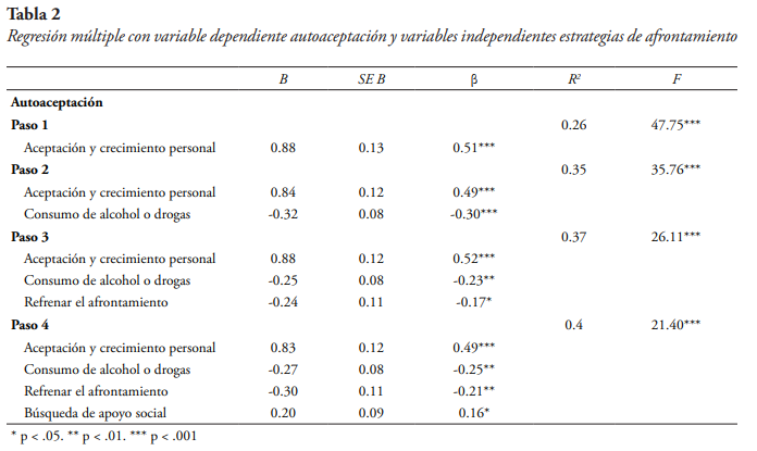 Para la variable dependiente de autoaceptación (véase tabla 2), el modelo de ajuste más adecuado identificó cuatro predictores: aceptación y crecimiento personal (β = .49 p < .001), consumo de alcohol o drogas (β = -.25, p = .001), refrenar el afrontamiento (β = -.21 p = .008), y búsqueda de apoyo social (β = .16, p = .028). El modelo explicó el 40 % de la varianza (R2 = .40, F(4,130) = 21.40, p < .001).