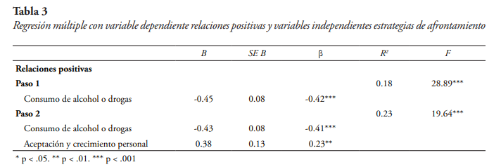 Para la variable dependiente de relaciones positivas (véase tabla 3), el modelo de ajuste más adecuado identificó dos predictores: consumo de alcohol o drogas (β = -.41, p < .001), y aceptación y crecimiento personal (β = .23, p = .004). El modelo explicó el 23 % de la varianza (R2 = .23, F(2,132) = 19.64, p < .001).