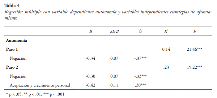 Para la variable dependiente autonomía (véase tabla 4), el modelo de ajuste más adecuado identificó dos predictores: negación (β = -.33 p < .001), y aceptación y crecimiento personal (β = .30, p < .001). El modelo explicó el 23 % de la varianza (R2 = .23, F(2,132) = 19.22, p < .001).
