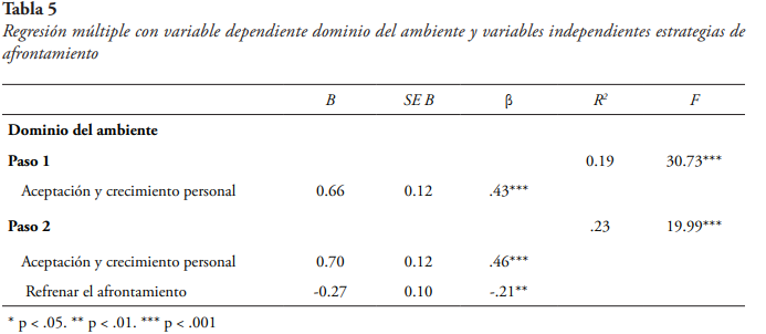 Para la variable dependiente dominio del ambiente (véase tabla 5), el modelo de ajuste más adecuado identificó dos predictores: aceptación y crecimiento (β = .46, p < .001), y refrenar el afrontamiento (β = -.21, p = .006). El modelo explicó el 23 % de la varianza (R. = .23, F(2,132) = 19.99, p < .001)