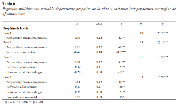 Para la variable dependiente propósito de vida (véase tabla 6), el modelo de ajuste más adecuado identificó cuatro predictores: aceptación y crecimiento personal (β =.41, p < .001), refrenar el afrontamiento (β = -.28, p = .001), consumo de alcohol o drogas (β = -.21, p = .008), y búsqueda de apoyo social (β = .15, p = .049). El modelo explicó el 33 % de la varianza (R.= .33, F(4,130) = 15.97, p < .001). Latabla 6 contiene todos los pasos del análisis.