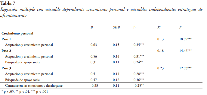 Para la variable dependiente crecimiento personal (véase tabla 7), el modelo de ajuste más adecuado identificó tres predictores: aceptación y crecimiento personal (β =.28, p < .001), búsqueda de apoyo social (β = -.36, p < .001) y centrarse en las emociones y desahogarse (β = -.25, p = .005). El modelo explicó el 23 % de la varianza (R. = .23, F(3,131) = 12.93, p < .001)