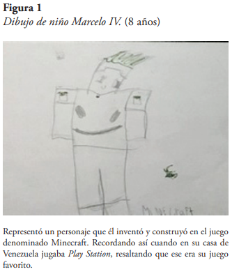 La figura 1 corresponde a un dibujo confeccionado por Marcelo IV, quien representa un personaje que él había realizado digitalmente en Venezuela, siendo esto significativo debido a la carga cultural que le atribuye, asociada con sus experiencias de juegos y diversión.