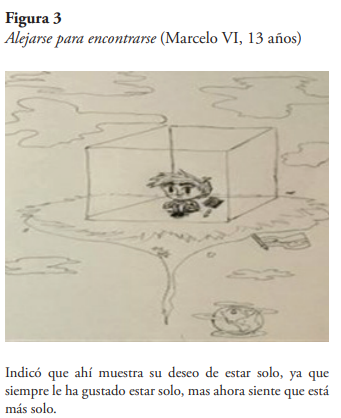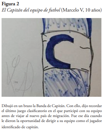 En cuanto a Marcelo V, dice extrañar todo de su hogar anterior: sus cuartos, los muebles y diversas zonas de la casa, y hasta “Extraño las escaleras de mi casa”, manifiesta. Lo que se extraña generando la tristeza propia del desarraigo (Quintero, 2021), va desde sus familiares dejados atrás, sus mascotas, sus juguetes, sus compañeros de juego, su escuela, hasta los espacios exteriores por donde transitaban habitualmente: parques, plazas, centros comerciales, entre otros. Además de las personas y objetos familiares, la sensación de pérdida, característica del desarraigo, se asocia también con expresiones de su imaginario simbólico y con sus actividades habituales en el país de origen; por ejemplo, el ir a algún club deportivo, tal como el de fútbol o béisbol.