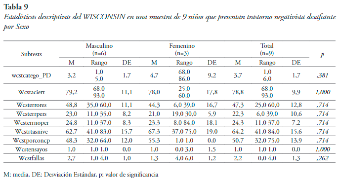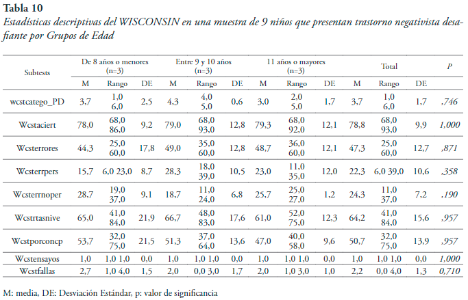 Prueba Wissconsin. Para la variable sexo se identificó una alta variabilidad, lo mismo ocurre cuando se analiza la variable edad. Estos resultados sugieren, que el desarrollo del principio de organicidad, de flexibilidad cognitiva y de abstracción se presenta de forma diferente en sujetos con TND de distinto sexo. Aspecto que puede depender de factores tales como estimulación, áreas cerebrales encargadas y neurodesarrollo.