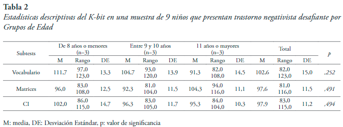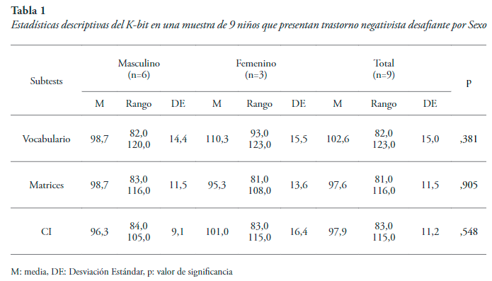 Resultados del K-Bit. Se encontraron puntuaciones muy similares entre niños y niñas, no aparecen diferencias significativas entre ellos en lo que se refiere al coeficiente intelectual. Esto sugiere que las dificultades académicas y de adaptación al entorno de los niños que presentan TND en este caso, no se explican desde deficiencias cognitivas.