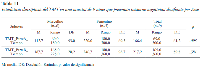 Prueba TMT. Teniendo en cuenta la variable sexo se observa una variabilidad alta en las puntuaciones. Ello indica que en tareas que miden coordinación visomotora, velocidad de procesamiento y de acción aparecen diferencias según se trate de varones o hembras que presentan TND.