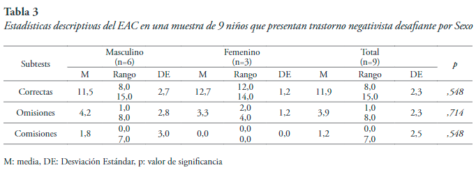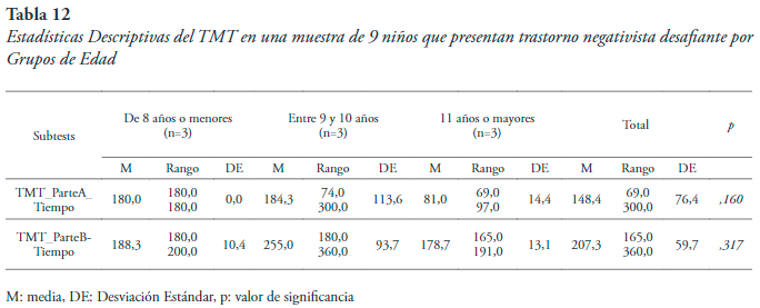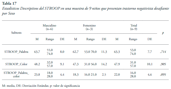 Esto sugiere que el desempeño en pruebas de inhibición de tareas prepotentes es similar en los varones y las hembras que presentan TND, y que los puntajes que reflejan el test de Stroop son bajos, lo cual confirma las dificultades inhibitorias que manifiestan los niños con este tipo de desórdenes. Es importante considerar que una de las principales funciones ejecutivas es la inhibición, y algunas investigaciones proponen que se desarrolla con la edad y manifestaciones más evidentes a partir de los 12 años (Gerstadt & Diamond, 1994).