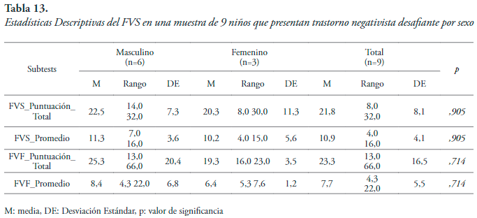 Prueba de Fluidez semántica y fonológica. Aparecen algunas diferencias según se trate de la variable sexo o la variable edad. Para la variable sexo se observa una variabilidad muy alta (tabla 13), pero las puntuaciones medias son bajas, según la guía para el diagnóstico neuropsicológico (Ardila & Ostrosky, 2012). Esto pone en evidencia un desempeño pobre en los sujetos que presentan TND en pruebas de fluidez verbal que evalúan la producción espontánea de palabras.