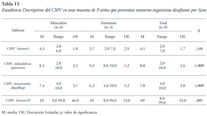 Prueba de memoria verbal. En el análisis de la variable según el sexo existe una alta variabilidad. Además, los sujetos que presentan TND suelen obtener puntuaciones bajas, que sugieren dificultades en la memoria, tales como la codificación y la evocación.