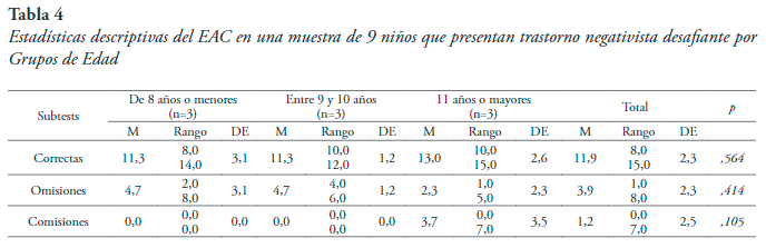 Respecto de la variable edad también aparece una alta variabilidad entre los grupos considerados. En función de ello, puede interpretarse la existencia de un desarrollo distinto de las funciones neurocognitivas examinadas en niños con TND de diferente edad.