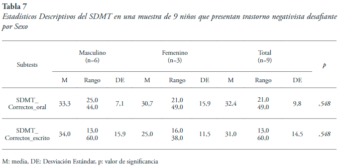 Prueba de símbolos y dígitos SDMT. Aparece una variabilidad alta de acuerdo a la variable sexo. Esto sugiere que existen diferencias en el desarrollo de la capacidad de asociación en, la memoria incidental, en la capacidad para enfocar y ejecutar una tarea, y en la destreza óculo-motora, en sujetos de diferente sexo que presentan TND.