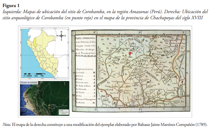 El sitio arqueológico de Corobamba se ubica en el nororiente peruano, en territorio actual del distrito Amazonas (figura 1), a una altura de 2676 msnm. El área donde se ubica Corobamba, como gran parte de Amazonas, corresponde a una zona montañosa, muchas veces rodeado de neblinas con una abundancia de flora y fauna nativa. En el caso de Corobamba, el área circundante presenta amplios espacios de relieve ondulado con grandes colinas, espacios semi-llanos y muchas cavernas de extenso tamaño y profundidad. Cabe resaltar que este sitio arqueológico y su entorno se encuentran asociados a la identidad ancestral de los pueblos de San Pablo (distrito de Valera) y San Carlos (distrito de San Carlos).