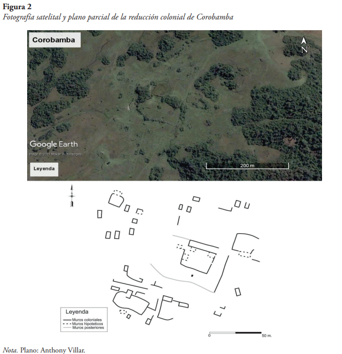 Luego de una revisión bibliográfica referente al sitio arqueológico de Corobamba y su entorno, realizamos un plano parcial mediante el uso de imágenes satelitales y de fotografías capturadas desde un equipo RPAS, apoyados además en un croquis elaborado in situ. De esta manera, cotejamos la planimetría del asentamiento con el patrón urbanístico en damero (compuesto por calles y manzanas) impuesto para las reducciones fundadas como parte de las reformas toledanas durante la segunda mitad del siglo XVI.