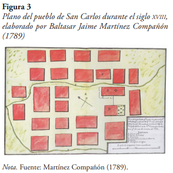 Una vez escogido el sitio el obispo envía dicha propuesta a Lima, donde fue discutida por los miembros de la Audiencia, en julio de 1783, quienes se mostraron a favor. Posteriormente, en agosto del mismo año, el virrey Teodoro de Croix escribe a Martínez Compañón aprobando la reubicación del pueblo de Corobamba. Por esta razón, el obispo recomienda al corregidor y al cura vicario de Chachapoyas que realicen la rápida reubicación del pueblo de Corobamba y construyan un puente de madera sobre el Utcubamba, que permita una mejor comunicación (Rodríguez, 2014). Cabe resaltar que Baltasar Martínez Compañón (1789) elaboró un plano de San Carlos (figura 3), el nuevo pueblo de los naturales de Corobamba, con la ubicación de los edificios principales.