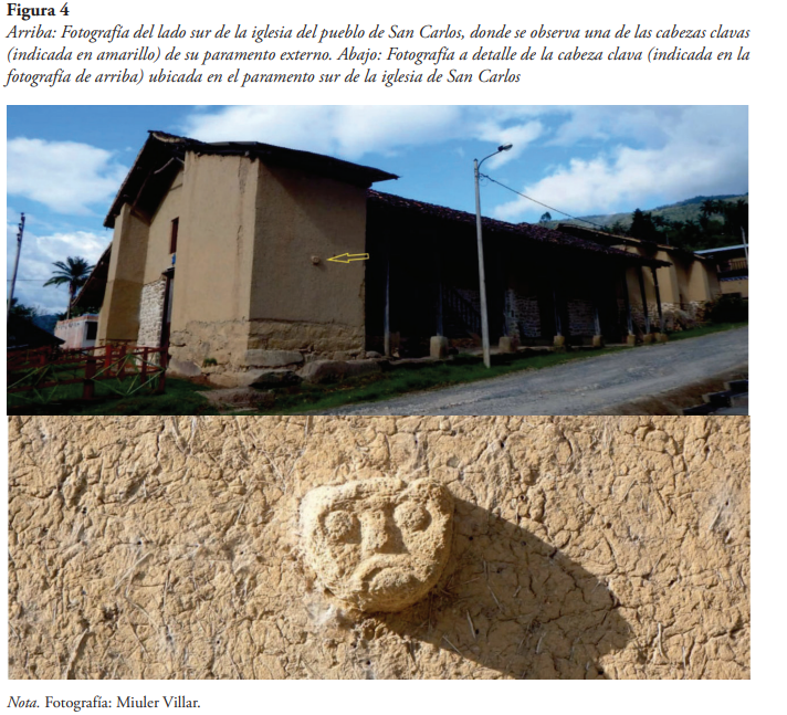 Otros objetos que pudieron trasladarse de Corobamba, corresponderían a dos cabezas clavas ubicadas en las paredes externas de la iglesia (figura 4). Este tipo de elementos son relacionados a la arquitectura prehispánica amazonense (sobre todo al sur; véase Guengerich, 2017; Schjellerup, 2005), por lo cual no sería descabellado considerar que estos objetos habrían formado parte de los muros de la iglesia de Corobamba, como en el caso de los frisos locales plasmados en la iglesia del siglo XVI en la Jalca Grande (Chachapoyas-Amazonas).