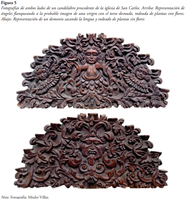 Para complementar los datos obtenidos, también revisamos algunos materiales culturales muebles, procedentes de la actual iglesia de San Carlos, los cuales, según los pobladores, provinieron de Corobamba en el proceso de su abandono. De esta manera, tratamos de cotejar la información con algunos rasgos diagnósticos de la iconografía presente en dichos objetos.