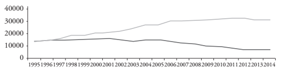 Para avanzar en una mejor caracterización de los proveedores educativos en Chile, hemos decidido no basarnos únicamente en la personalidad jurídica que utilizan los proveedores o la finalidad que declaran, sino que además incorporar sus redes con el aparato productivo, así como sus relaciones con grupos de poder y sus prácticas educativas y políticas. Entre el período 2009 y 2010 (CORBALÁN; GONZÁLEZ; LIGÜEÑO, 2009; GONZÁLEZ et al., 2010), una primera caracterización fue hecha en la RM de Chile (región con más sostenedores en el país). Se revisaron las redes comerciales, políticas e ideológicas de una muestra aleatoria de personas (naturales o jurídicas) que tiene escuelas particulares subvencionadas, además revisamos las escuelas que estaban vinculadas (directa o indirectamente) a ellas, realizando así una primera caracterización del sector (GONZÁLEZ; LIGÜEÑO; PARRA, 2012b). Posteriormente, se incluyó una indagación longitudinal de los datos enfocados en una comuna (La Pintana, de la RM de Chile)10. En esta ocasión, además de analizar las redes de cada sostenedor, número y tipo de escuelas, se adicionaron variables tales como la matrícula (Gráfico 1), los resultados educativos y la vulnerabilidad de la población escolar en 20 años (1995 y 2014).