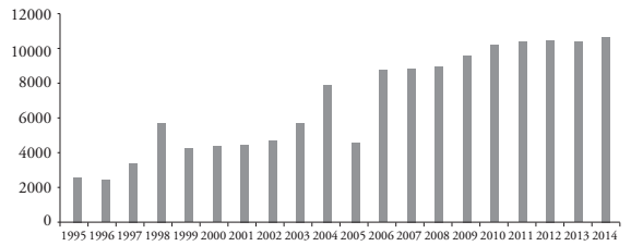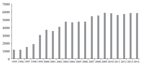 • Los inversionistas: aparecen vinculados directamente en más de una actividad con fines económicos, son miembros de directorios de empresas, sociedades anónimas y/o accionistas, resultando la escuela una actividad más entre otros rubros. No poseen vínculos claros con grupos económicos poderosos, ni políticos/ideológicos, aunque pueden tenerlos en forma secundaria. Algunos inversionistas se ligan a gremios como la Asociación Gremial Colegios Particulares de Chile (CONACEP)16. Han tenido la capacidad para invertir, desarrollando proyectos lucrativos y bien posicionados en el "mercado educativo". Tienen uno o más establecimientos grandes (más de 1.000 estudiantes), cobran FICOM17 y logran contar con mejor infraestructura e imagen corporativa que la competencia. Algunos de ellos son conocidos como los "mega sostenedores"18, ya que tienen varios establecimientos mediante sociedades anónimas o intermediarios. Son empresarios y/o comerciantes que ven en la educación un buen negocio, generan economías de escala y tienen capacidad para poner capital propio en principio, lo que les permiten obtener ganancias a mediano plazo19 operando algunos como verdaderos holdings educacionales. En la comuna La Pintana, este grupo, compuesto por siete entidades20, creció en matrícula y selectividad. Actualmente, controlan el 27,9% de la matrícula comunal. En el año 1995, con dos entidades, atendían a 2.596 estudiantes. Al año 2014, alcanzan a 10.707 estudiantes con nueve establecimientos (Gráfico 2). Debido a la selectividad económica (cobran FICOM), atienden a un grupo de baja vulnerabilidad (70,59 puntos) en relación a los municipales. De los nueve colegios pertenecientes a los grandes comerciantes en La Pintana, ocho cobran una cuota mensual21, lo que excluyen a las familias más pobres.