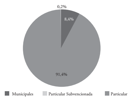 En Chile, la oferta en esta área es casi toda privada. Actualmente, hay 1.817 escuelas especiales, sólo 153 son municipales (8,4%), 1.661 son particulares subvencionadas (91,4%) y 3 particulares pagadas (0,2%), como visto en el Gráfico 4.