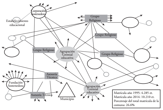 • Los grupos de poder: estrechamente ligados a los grupos de poder económico y político-ideológico, se vinculan en redes y logran incidir en la toma de decisiones sobre la educación pública. Participan o están vinculados con directorios de empresas controladoras de recursos naturales, industriales y financieros, además se vinculan a sectores conservadores de la Iglesia Católica. Por medio de las fundaciones y corporaciones sin fines de lucro, sostienen una o varias escuelas, en general de más de 1.000 alumnos, con edificios de buena infraestructura y equipamiento debido al financiamiento complementario que reciben vía donaciones del empresariado. Por ejemplo, en el bienio 2006-2007, de casi 30 millones de dólares que tuvo el fondo público de donaciones empresariales para la educación11, en la RM, el 90% se lo repartieron entre 55 escuelas a estos grupos, el resto fue a la educación del Estado, nada para otras escuelas privadas, de otro tipo de sostenedores. Así, año tras año se concentra este tipo de fondo en este sector. Tienen uno o varios colegios, que pueden estar en red, conectados entre ellos, mediante otras fundaciones o instituciones eclesiásticas y/o educativas. Constituyen redes entre ellos que coinciden en proyectos educativos, intercambio de recursos y patrocinadores12. Su conexión semeja a un rizoma13 (Diagrama 1), sin un centro común, que hipotetizamos se puede extender a través de algunas comunas y regiones, de todo Chile.