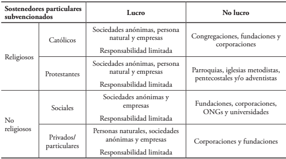 Frente al proceso descrito y la necesidad de fortalecer la educación pública, nos hacemos la pregunta ¿Quiénes son los privados que se hacen cargo de la provisión educativa subvencionada? La investigación en Chile ha sido escasa, a principios de los 2000 aparecieron los primeros indicios sobre este tema. Almonacid (2004), utilizando datos del Ministerio de Educación del año 2001, caracteriza a los sostenedores educacionales según el tipo de personalidad jurídica5 y el tipo de establecimientos que tienen. De esta forma, describió a los sostenedores particulares como: "los religiosos", principalmente adscritos a la religión católica, seguido de las iglesias evangélicas y otros credos; "los sociales", ligados a la beneficencia, como las fundaciones y corporaciones; y "los privados", desglosados en personas naturales y en sociedades anónimas, con fines de lucro6. Por otra parte, McEwan (2002) y posteriormente Elacqua (2006) proponen una clasificación de los sostenedores del sistema particular subvencionado en: particulares no religiosos con fines de lucro, que pueden ser tanto personas naturales como sociedades; particulares católicos, incluyendo congregaciones, parroquias y fundaciones religiosas; particulares protestantes, con la ramificación en iglesias metodistas, pentecostales y/o adventistas; y por último, particulares sin fines de lucro, como fundaciones, corporaciones, organizaciones no gubernamentales (ONGs) y universidades. Otra clasificación propuesta por Corvalán, Elacqua y Salazar (2009) plantea la existencia de sostenedores con fines de lucro, persona natural o jurídica, y sostenedores sin fines de lucro, como son las fundaciones o corporaciones, que pueden o no expresar una misión u orientación de tipo religiosa. La Tabla 1 presenta una síntesis de las clasificaciones señaladas.