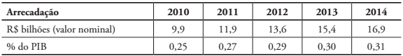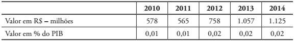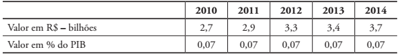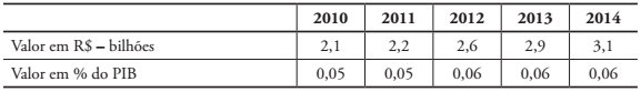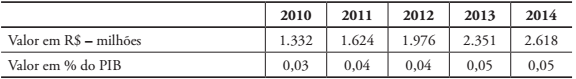 Como se pode observar no Quadro 1, uma parte dos recursos do sistema é direcionada a programas de formação profissional, enquanto outra destina-se a programas de assistência social aos trabalhadores. A Tabela 1 apresenta o montante dos valores arrecadados pelo sistema no período de 2010 a 2014, em reais e em percentual do Produto Interno Bruto (PIB).