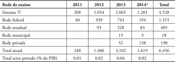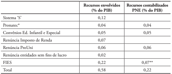 Contata-se, pela Tabela 9, um gasto total de 0,58% entre recursos destinados diretamente a redes privadas de ensino ou de renúncia fiscal (gastos tributários). Considerando o PIB de 2014, chega-se ao valor de R$ 32 bilhões. Para se ter uma ideia do seu peso, esse valor representa mais de 3 vezes o complemento da União ao Fundeb e 56% de todo o gasto federal, em 2014, com manutenção de desenvolvimento do ensino.